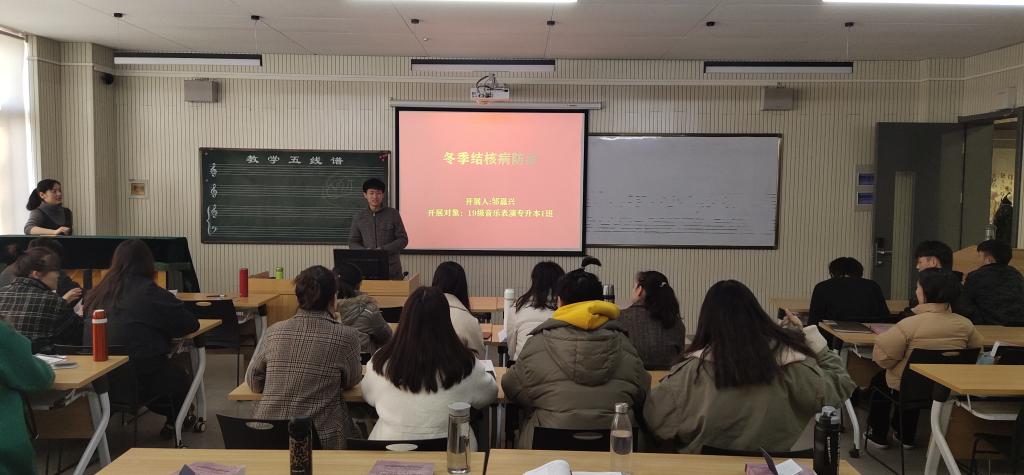 为增强大学生结核病防控意识,遏制结核病流行,营造学生共同关注、群防群治的良好氛围。12月3日下午,艺术学院19级音乐表演专升本班在艺术楼302教室开展了冬季结核病防治知识主题班会。