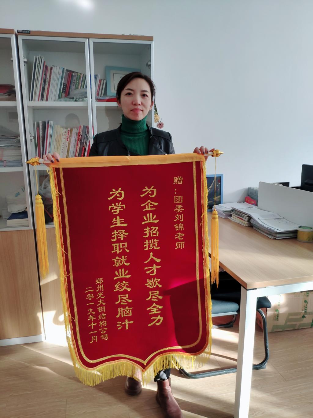 郑州光大钢结构有限公司早在几周前参加了会计学院2020届毕业生的专场招聘会,由于是第一次参加校园类的招聘会,没有太多招聘经验的公司负责人陈科长多次与刘锦老师打电话联系询问具体事项,在刘锦老师的耐心引导和帮助下,该公司在我院招聘会上成功招聘了3名毕业生到公司从事会计类工作,该公司发现我校毕业生工作业务能力强,素质高,对我院毕业生的表现给予了高度的评价,为了表示对刘锦老师的感谢,还专门制作了一面锦旗赠予刘老师,并表示愿意长期合作,在双方深入交流之后,该公司与我院签订了校企合作协议。