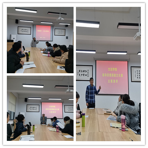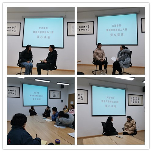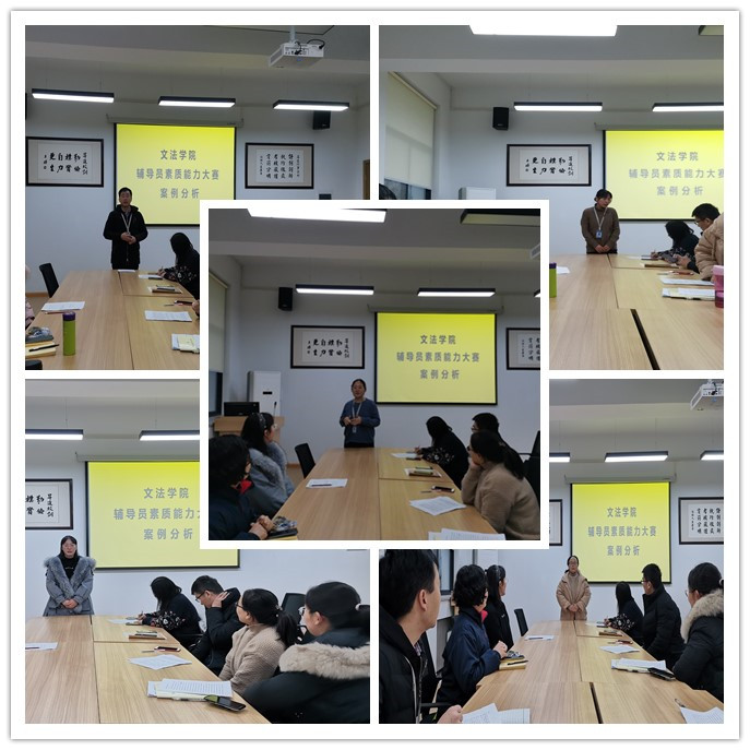 为深入贯彻党的十九大精神,推动我院辅导员职业化、专业化发展,提升辅导员工作职业技能和工作水平,继2019年12月25日和2019年12月30日进行辅导员综合素质能力大赛笔试环节和班会大赛环节后,2020年1月2日至1月6日,文法学院进行了辅导员综合素质能力大赛之谈心谈话、案例分析和主题演讲比赛,文法学院行政秘书郑玲玲老师及全体辅导员参加。