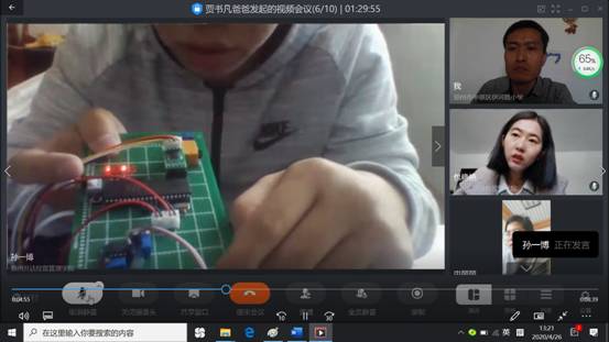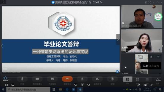 网络答辩过程,采用钉钉视频会议的方式进行,每次让一名毕业生加入会议,参加答辩的学生结合自己的答辩PPT依次进行自我介绍、毕业论文自述、查重报告展示、硬件运行演示等环节,答辩组老师进行提问,考察学生对自己论文内容的熟悉程度、以及在实际应用中的见解、回答问题的角度等,并对论文中存在的问题给予指导。学生离开会议后,答辩组老师对学生的论文及答辩情况进行讨论,确定学生的答辩分数。整个过程进展的有条不紊,井然有序,并进行全程录屏,画面清晰。信息工程学院白鑫院长、教学秘书赵会燕对整个网络答辩过程进行了旁听,白院长就答辩中的具体细节进行了指导。