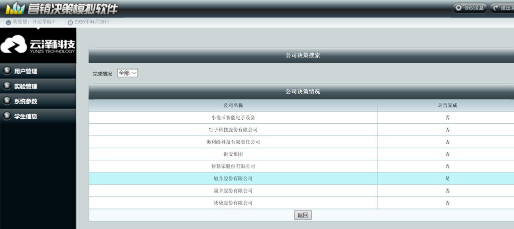 第二,云端服务器教师端监控。服务器教师端能够查看学生在线情况(如图3),也能够学生的每一次决策进度进行监控(如图4),学生的数据可以导出查看,每一季度的操作均需要提前上交决策报告,上传至网络系统,老师查看打分。