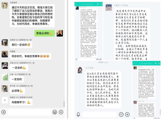 各支部积极组织同学们认真学习了武陟县中水寨村马明杰等10名大学生,在2020年初新冠肺炎疫情防控斗争中,积极响应党中央号召,利用寒假返乡之际,主动报名、投身所在乡村的疫情防控和脱贫攻坚工作,以自己所学知识和实际行动回报家乡父老的先进事迹。马明杰等10名大学生展现出了新时代大学生坚定理想信念,勇于担当,甘于奉献,用青春建设家乡、回报祖国的精神力量。