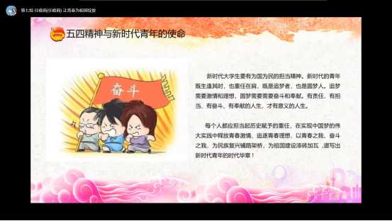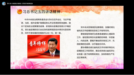 在第七组组长孙慧兴的带领下,小组成员进行文章精读讨论,并制成学习视频。在直播教学阶段,第七组学员任晓莉作为主讲,带领全体学员进行分享交流。在直播过程中,全体学员振奋不已,纷纷表示青年人应该不断奋斗,为祖国的建设贡献力量。主讲人通过对五四运动和新冠肺炎中青年的贡献做类比,使全体学员对于民族大义和奉献精神有了更深入的了解,青年们无论何时都应首当其冲,为实现国家独立、民族复兴而奋不顾身。