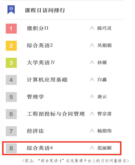 从传统的面授课堂到线上教学,小组内各位教师团结一心,共克时艰。在团队共同努力下,“综合英语4”优慕课平台学习人次稳定排名靠前。在我校教务处优慕课平台统计的课程日访问量中,全校排名第8位,并且在课程总访问量的统计中,全校排名第13位,达到131562人次。