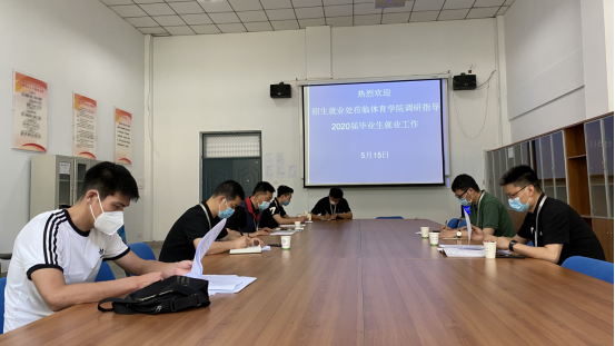 为进一步做好毕业生就业服务工作,提高我校2020届毕业生就业工作质量, 5月15日上午,招生就业处刘景向处长、冯科科长一行莅临体育学院指导就业工作。体育学院张王利院长、韩炎涛书记、行政秘书高建涛、社体教研室主任金海波老师、体育舞蹈于贝贝老师、辅导员陈阳光和康晓晨出席本次会议。