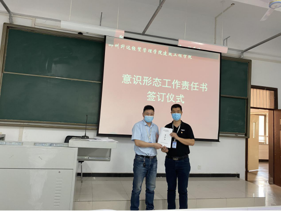 韩书记做了最后总结,全体教职工一要深化思想认识,以高度的政治责任感抓好本次会议精神的学习贯彻,切实把思想和行动统一到会议精神和工作部署上来。并要结合工作的实际情况及时反馈,制定具体计划,完善思路举措,创新方式方法,切实推进各项工作落地落实落细。会议最后,韩炎涛书记与学院院长、各学生党支部书记、辅导员、教师签订了意识形态工作责任书。