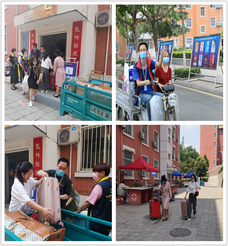 学生宿舍楼前,机动三轮车整装待发,教师服务队均已到位,同学们打包好行李后,老师们不辞辛苦帮助学生一趟趟从宿舍搬运行李,其间,王卫丽老师帮助李同学从学生宿舍5楼搬运完全部行李后,该同学非常激动地说:“我所有的书、褥子、衣服等行李均是王老师帮我搬运下来,然后楼下老师帮忙运到大门口,让我轻松了很多,太感动了,非常感谢老师们的帮助。”