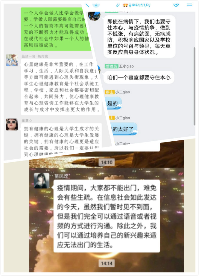 从按时观看课程学习,到观后同学们的讨论中我们可以看到,绝大多数的学生已经慢慢适应了疫情带来的各种影响并逐步调整了自己心态,提升了心理抗疫力。