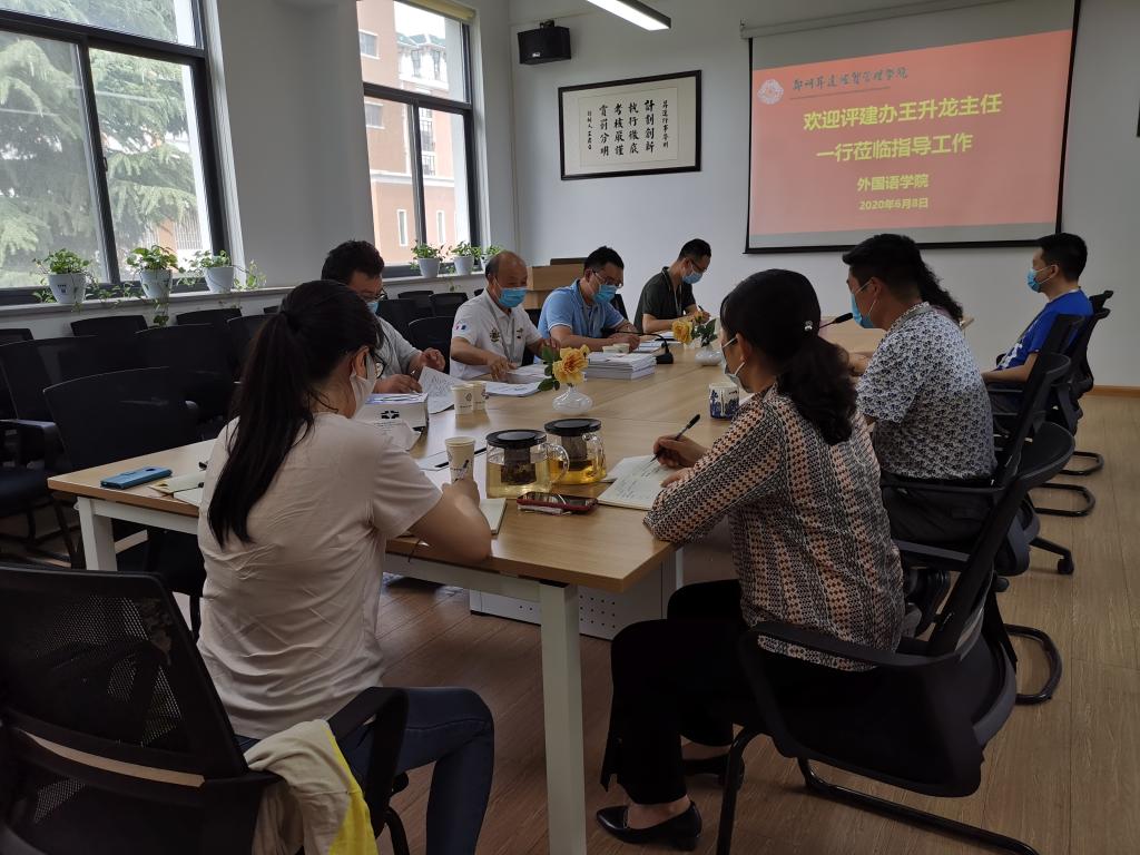 6月8日下午,学校教学质量监测与评估中心王生龙主任等一行4人莅临外国语学院,针对我院评估整改工作展开调研。外国语学院张梦院长、石皓召书记、教学秘书王璨老师及各位教研室主任参加了座谈会。