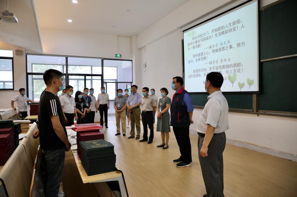 校领导们为获得省级优秀毕业生、校级优秀毕业生、学业成绩第一名、考研奖学金获得者陆续颁发奖项并合影。