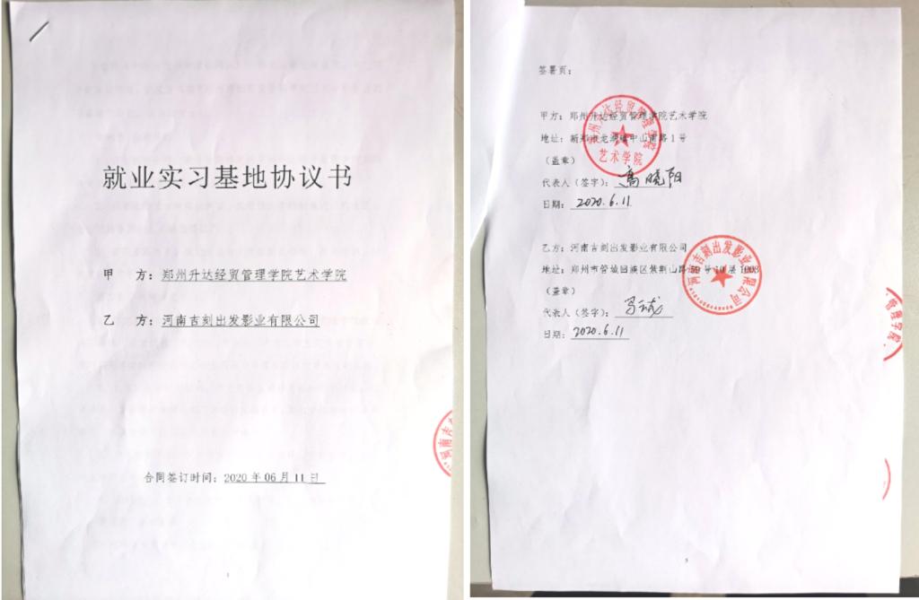 6月11日,我院代表与河南吉刻出发影业有限公司企业双方签订了就业实践基地协议书。