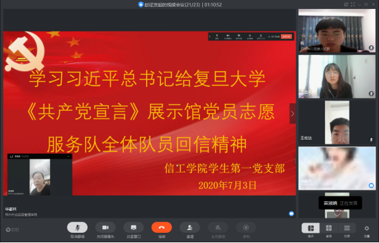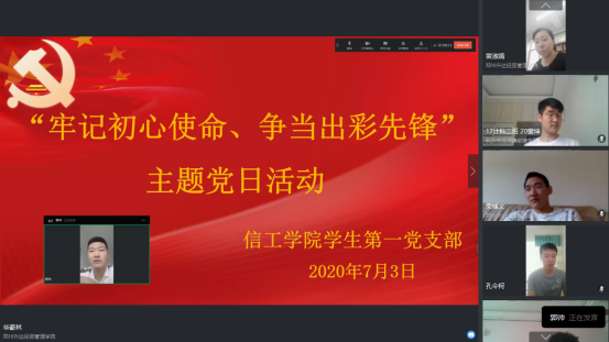 为庆祝中国共产党成立99周年,不断巩固拓展“不忘初心,牢记使命”主题教育成果,学习出彩先锋。信工学院学生第一党支部于7月3日上午召开“牢记初心使命、争当出彩先锋”主题党日活动,受疫情影响,支部所有学生成员都在家学习,通过支部钉钉视频会议进行本次主题党日活动。会议由学生第一党支部书记苗淑娟老师主持,第一支部全体成员参加本次党日活动。