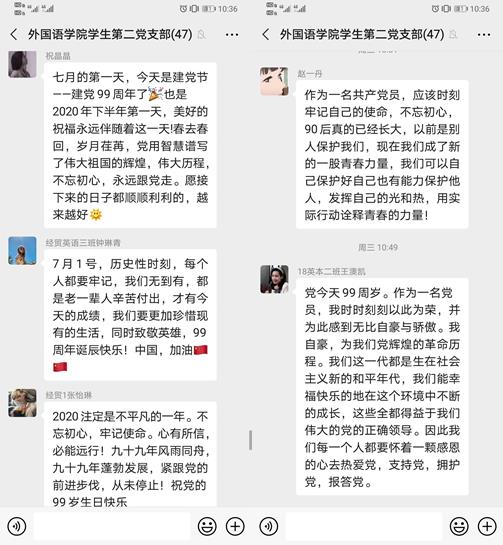 活动中,全体党员同志首先共同观看了“高校党组织战‘疫’示范微党课‘七一’专题”的相关视频。随后由支部书记赵丽红老师组织全体党员在微信群进行发言讨论。支部成员钟琳青说:7月1号,历史性时刻,每个人都要牢记,我们无到有,都是老一辈人辛苦付出,才有今天的成绩,我们要更加珍惜现有的生活,同时致敬英雄,99周年诞辰快乐!中国,加油!祝晶晶说:七月的第一天,今天是建党节—建党99周年了也是2020年下半年第一天,美好的祝福永远伴随着这一天!春去春回,岁月荏苒,党用智慧谱写了伟大祖国的辉煌,伟大历程,不忘初心,永远跟党走。愿接下来的日子都顺顺利利的,越来越好!张亚楠说:2020年可谓不平凡的一年,同时在这个时候又展现了中国强有力的政治保障和人为关怀!今天又是我党99岁的生日,习主席给我们青年知识分子寄托了厚望与关怀!作为一名青年学生党员,更应该时刻牢记自己的责任和使命,现在自己能做的就是努力全面提升自己的能力,让自己今后能为社会国家做出一份自己的贡献!我们这一代的青年人,在祖国的大好河山下能靠自己的努力掌握自己的未来实属幸福和幸运!因此,我们应该时刻的以党员的高标准、严要求提升自己,不断加强思想道德建设,同时也付诸实践,努力提升自己!不断砥砺前行,遇到更好的自己,未来可期,共勉!