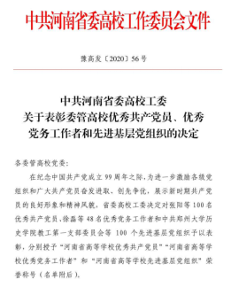 近日,中共河南省委高校工委印发《关于表彰委管高校优秀共产党员、优秀党务工作者和先进基层党组织的决定》(豫高发〔2020〕56号),建工学院教工第一党支部受到表彰,荣获“河南省高等学校先进基层党组织”称号。