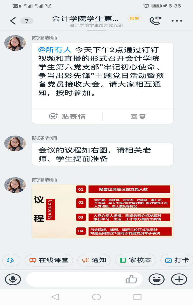 为庆祝中国共产党成立99周年,为推进支部建设,引导广大党员同志牢记初心使命,争当出彩先锋,深刻体会党员和人民群众的密切联系,会计学院学生第六党支部于2020年7月6日下午2点举行“牢记初心使命,争当出彩先锋”主题党日教育活动暨预备党员接收大会,受疫情影响,本次会议通过钉钉直播的形式举行,由会计学院学生第六党支部书记陈晓老师主持。