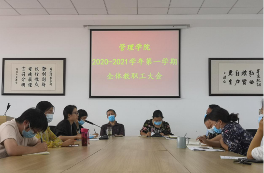 为推进新学期各项工作的顺利开展,管理学院于8月31日在2号楼209举行2020-2021学年第一学期全体教职工大会,对新学期的教学、管理等重点工作进行安排部署。管理学院院长纪德尚、党总支书记张小雁、学院副院长唐云、教学秘书朱影影、行政秘书许广庆以及全体教职工参加了此次会议,会议由张小雁书记主持。
