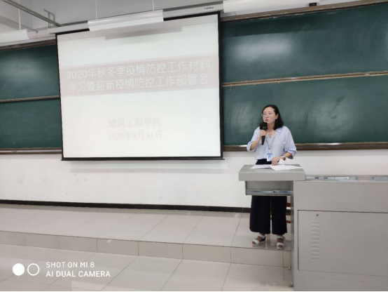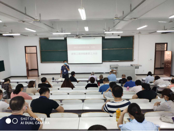 2020年9月1日上午10点,建筑工程学院召开了2020—2021学年第一学期第一次全体教职工大会暨秋冬季新冠肺炎防疫工作学习布置大会。会议由院长杨开云教授主持,学院党总支书记韩炎涛同志、副院长高燕、教学秘书齐雷、行政秘书赵杨等全体教职工参加。