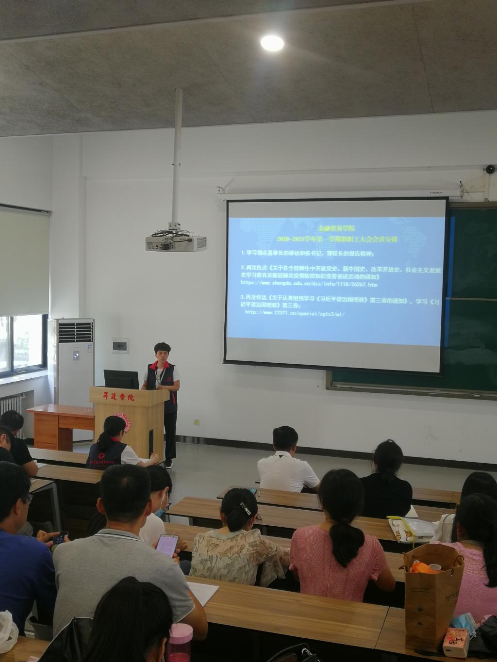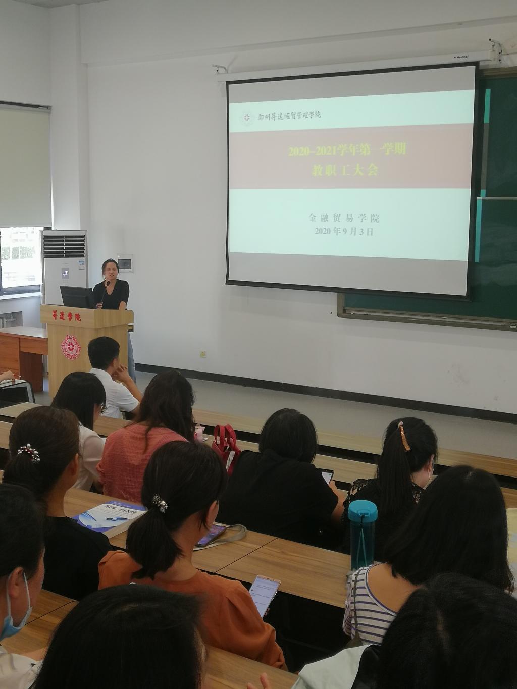 9月3日,金融贸易学院全体教职工在教学3号楼107召开2020-2021学年第一学期教职工大会。金融贸易学院院长何伟、党总支书记钟江鸽同志、副院长杨毅副教授、行政秘书王娟老师及全体教职员工参加了此次会议,会议由金贸学院教学秘书张阳老师主持。