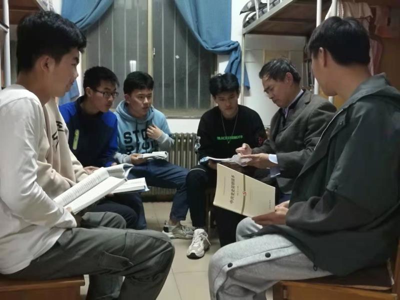同学们不仅听的认真,而且还积极参与讨论,畅谈对中国共产党百年历史的认识。20级金本1班班长曹轲杰说:“从党百年的辉煌历史可以知道,共产党的执政地位是历史形成的,是民心所向。人民拥护共产党,共产党为人民服务。有了人民的支持,战无不胜攻无不克;有了人民的支持,什么艰难险阻都可以克服。淮海战役时,老百姓推车、挑担,支援前线解放军,我们取得了解放战争的胜利。今天,在党的领导下,全国人民上下一心,又战胜了疫情。”20级金本1班邹亚宁同学谈到:“通过学习党史,我特别佩服共产党人为国家解放、民族独立而献身的精神,最近看了电视剧《觉醒年代》,感触更深。李大钊、陈独秀、毛泽东这些有识之士为探索救国救民道路,奋起抗争,上下求索,从接受马克思主义,到运用马克思主义指导革命实践,为建立中国共产党作出了巨大贡献。”20级日语1班白如博同学谈到学党史心得时说:“在建党100周年时,重温党的历史,进一步增强了对党的历史的了解,增强了理想信念,坚定了跟党走的决心。要在今后的学习生活中,结合实际,认真学习,深入思考,把这次学习党史的精神领悟好,把自己的理想信念融入到为实现中华民族伟大复兴而奋斗的历史征程中。”这些是王盛恩博士、汤家玉博士、张奕阳博士、何涛博士等一批马院教师走进宿舍与同学开展党史学习交流时同学们的感言。