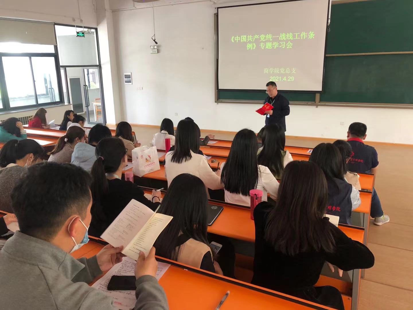 4月29日,商学院在教学二楼116召开教职工大会,组织全体教职工学习《中国共产党统一战线工作条例》,会议由商学院党总支书记宋维清同志主持。