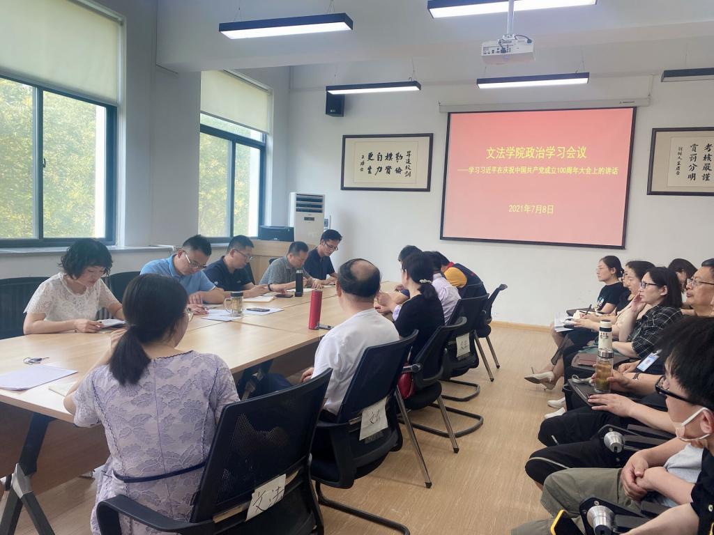 2021年7月8日上午,文法学院党委于教学1号楼314组织召开政治学习专题会议,文法学院院长段丰乐、学院党委书记刘晓川、副院长赵严俊、行政秘书郑玲玲、教学秘书李南方以及全体教职工参加了本次学习。