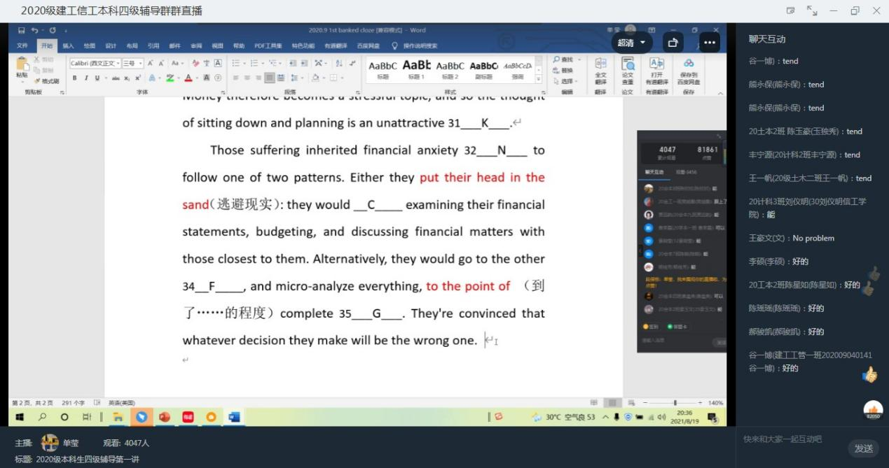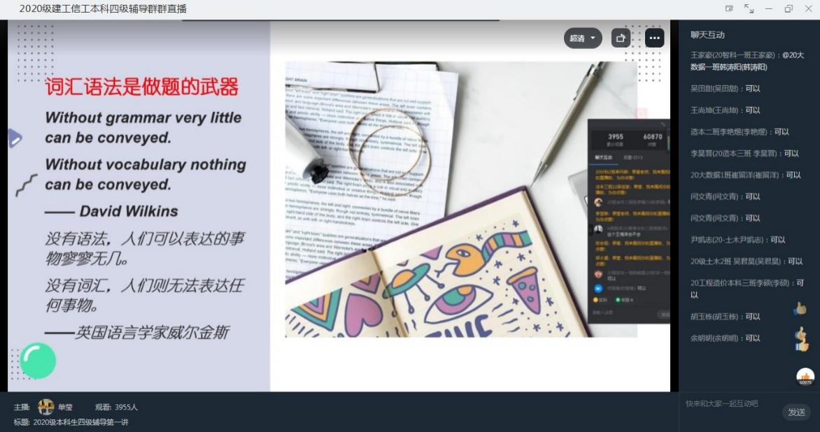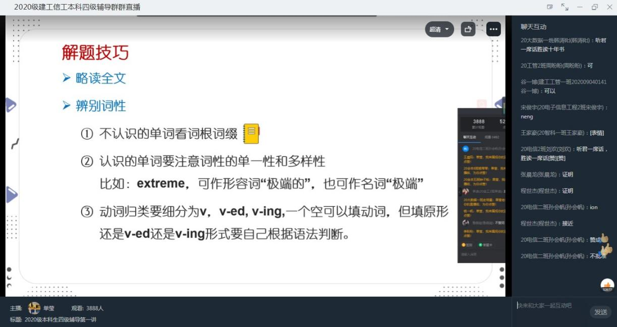 在此次讲座中,单莹老师从“选词填空”的题型特点、做题步骤、解题技巧等几个方面进行了细致入微的讲解,并结合四级真题和同学们一起将理论应用于实践。讲座生动有趣,同学们热情高涨,师生互动性强。据统计,最终共有4020名20级学生参加了此次讲座,直播中发消息数高达3577条。
