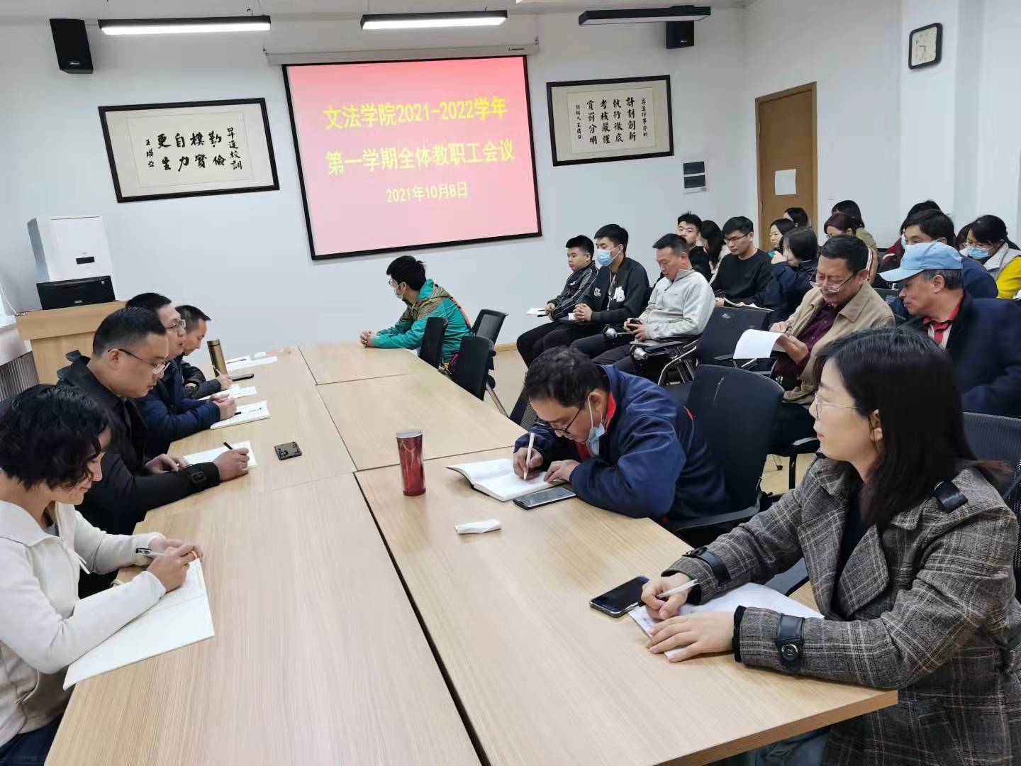 2021年10月8日上午9时30分,文法学院在会议室召开2021-2022学年第一学期全体教职工会议。会议由段丰乐院长主持。