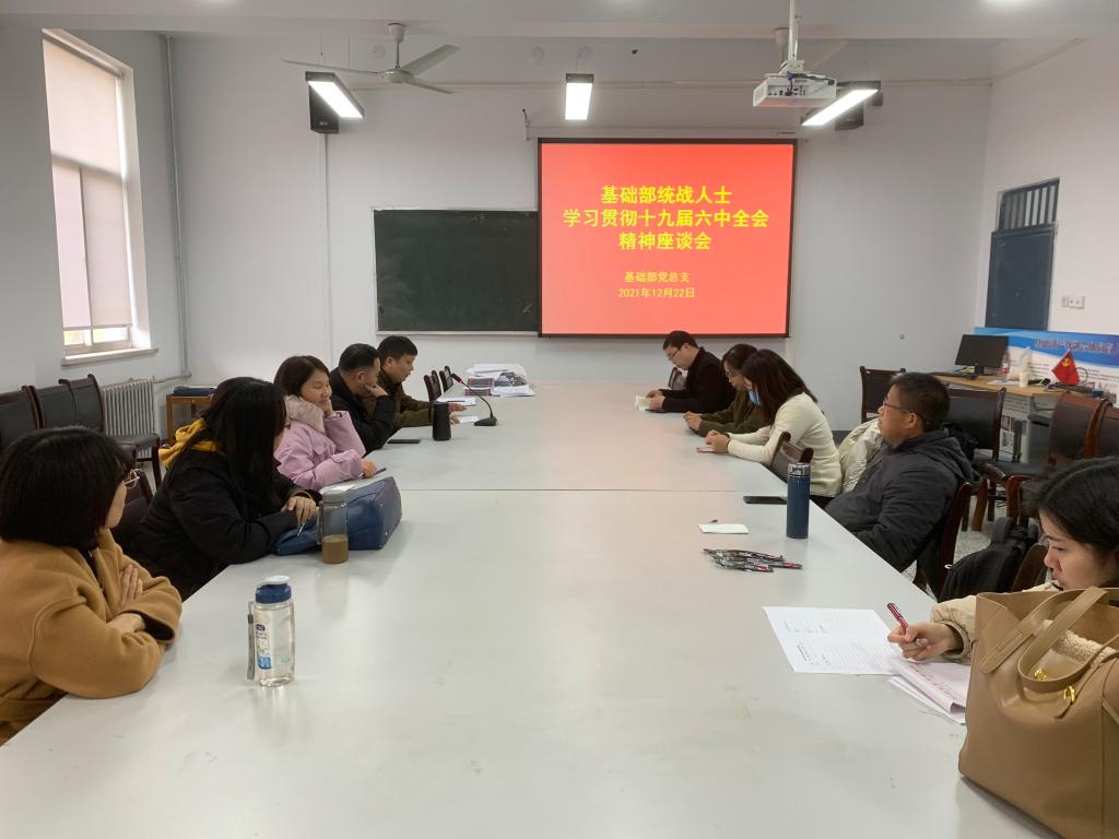 为宣传学习十九届六中全会精神,12月22日中午,基础部组织统战人士在综合楼218召开了专题座谈会。基础部党总支书记张志银、统战委员彭春燕、我部无党派人士、党外知识分子和留学归国人员代表参加了本次会议,会议由统战专员王森源支持。
