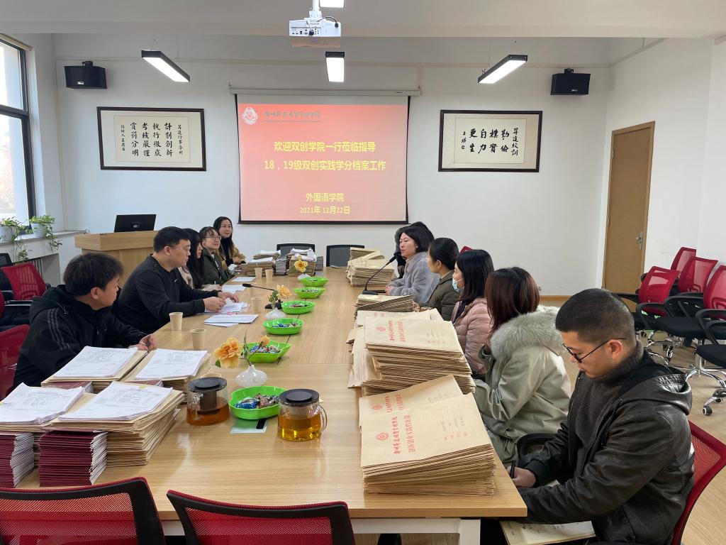 根据双创学院关于实践学分档案检查工作的安排,12月22日上午由双创学院实践管理科科长彭凯带队,广亚教育基金会代表、双创学院教师代表,以及其他二级学院双创工作专员一行,在教学1号楼206会议室对外国语学院18级、19级学生创新创业实践学分档案进行检查。外国语学院副院长崔瑾英、18级和19级全体辅导员老师参加此次检查工作会议。