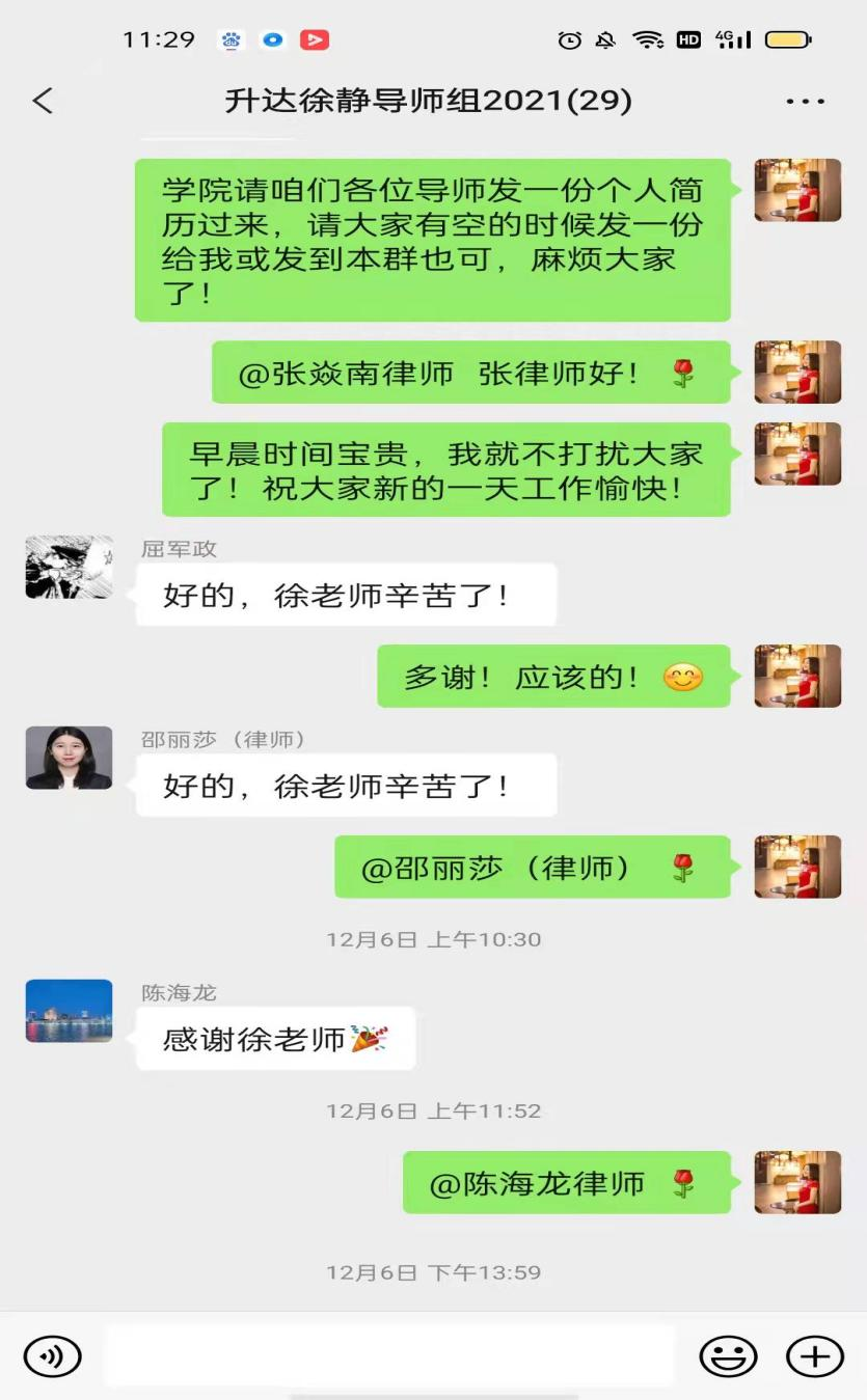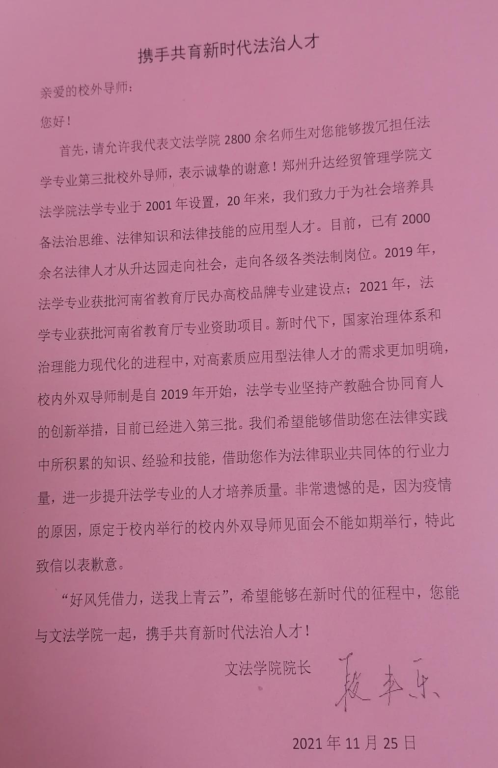 自2019年我院开始探索法学专业双导师制以来,今年双导师工作第三年。2021年10月以来,我院从自愿报名的实务部门专业导师中择优聘请了80多位律师、会计师等担任2021级法学专业新生的校外导师。因为疫情原因,无法邀请双导师到校参会,我们于12月上旬召开了线上双导师工作启动大会。段丰乐院长亲自给校外导师写了一封情真意切的感谢信,通过感谢信一方面向校外导师介绍了我院法学专业的建设情况及取得的成绩,另一方面也诚挚地邀请各位校外导师为我院法学专业人才的实践能力的培养不吝赐教。法学教研室对双导师制的具体工作精心部署,以校内导师为单位联系校外导师组建师生工作微信群,以方便导师对各自联系的学生进行时时辅导。同时各各位导师都寄去了聘书。