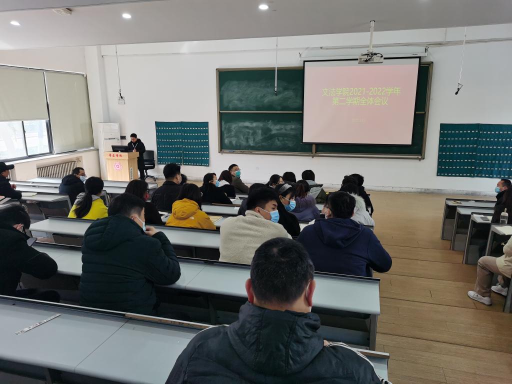 2022年2月21日上午,文法学院在教学一号楼118教室召开2021-2022学年第二学期全体教职工会议。会议由段丰乐院长主持。