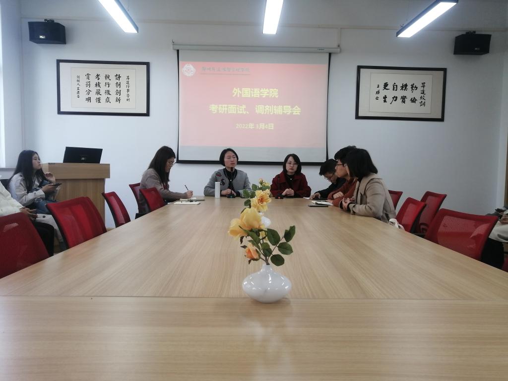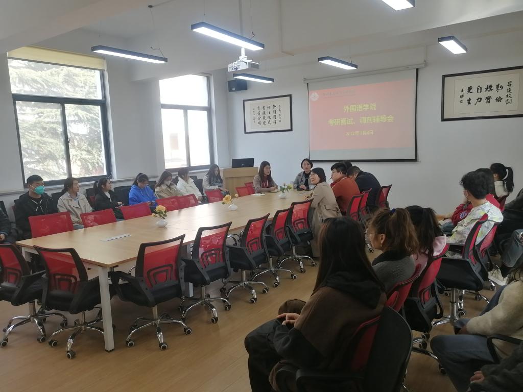为更好帮助2022届考研学生掌握复试及调剂的技巧与流程,确保考研工作的顺利进行。2022年3月4日下午15时,外国语学院在教一楼206会议室召开了考研面试、调剂辅导会。外国语学院副院长崔瑾英、行政秘书丁玥以及各教研室的代表老师,和近40位考研学生出席了本次会议。