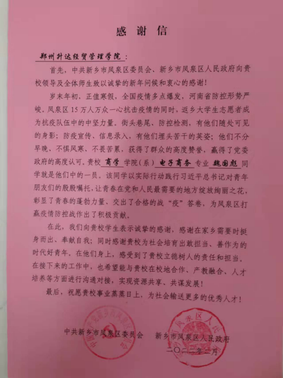 近日,商学院收到一封来自新乡市凤泉区人民政府的感谢信。信中对商学院2021级电子商务专升本2班的魏国彪同学,在疫情期间主动请缨,为疫情防控工作贡献力量,给予了高度评价,表示了诚挚感谢!