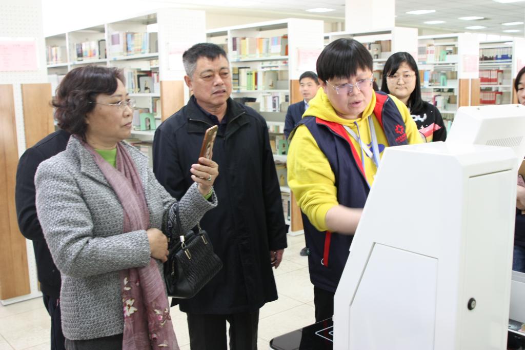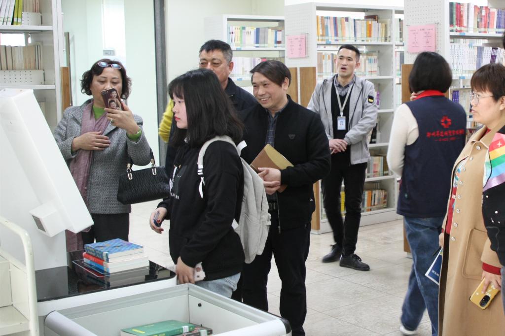 座谈结束后,晁国立馆长和科长们陪同客人一起参观了图书馆E化区、书库阅览区、纸电一体化期刊阅览室等区域。图书馆同仁为来访客人详细介绍了图书馆各区域功能布局,讲解本馆流通图书藏、借、阅一体化服务模式,展示自助借还系统、座位预约管理,介绍了现代化设备和朗读亭的使用等。在参观过程中,客人们对于本馆流通图书藏、借、阅一体化自助借还服务模式、现代化的服务设施无不交口称赞,高度认可本馆在信息化建设和读者服务方面的建设成果。