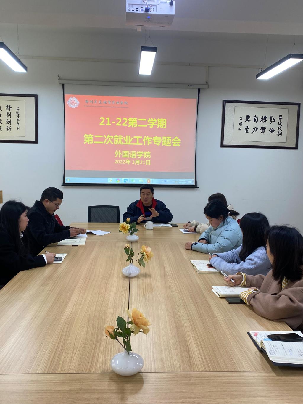 为助力2022届毕业生能就业、就好业,确保外国语学院2022届毕业生就业工作顺利开展。2022年3月21日上午10点,外国语学院在学院会议室召开了2021-2022学年第二学期第二次就业工作专题会议,会议由学院党委书记石皓召同志主持,2022届毕业班全体辅导员老师参加了会议。