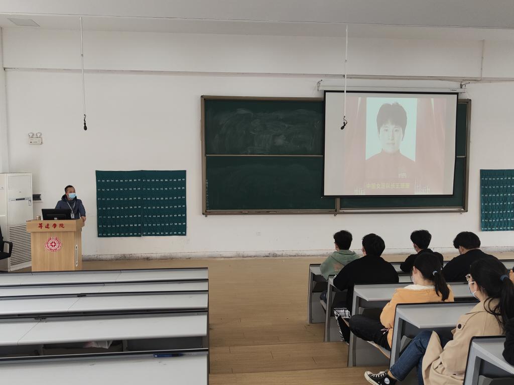 本次思政课主题是《扬中国女足精神做时代青年先锋》。赵严俊老师带领大家回顾了中国女足亚洲杯夺冠的精彩瞬间,着重向同学们介绍了来自河南洛阳的中国女足队长王珊珊的成长历程。赵院长从王珊珊的童年经历讲起,王珊珊的家庭并不富裕,练足球的日子很苦,还要忍受伤病的困扰,但是出于为国争光的梦想和对足球事业的热爱,她没有选择放弃而是勇敢坚持训练,此次中国女足夺冠也让王珊珊收获了自信与成功。