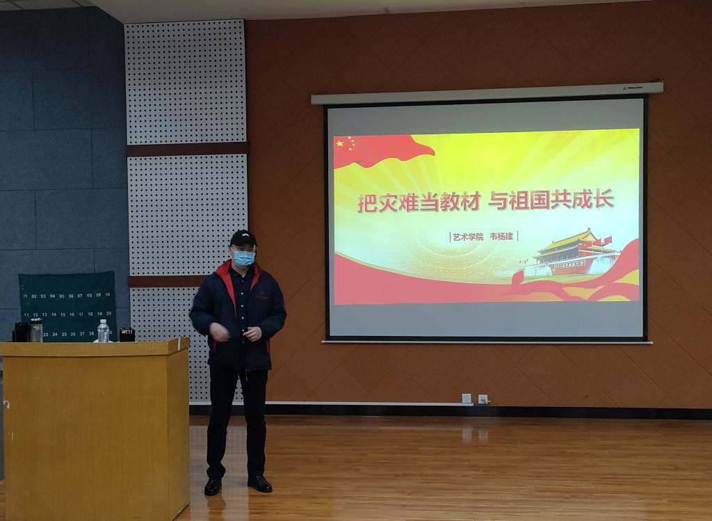 按照校党委宣传部发布的《2022年春季开学思政第一课实施方案》要求,深入贯彻习近平总书记关于“大思政课”建设的重要指示精神,全面落实《关于新时代加强和改进思想政治工作的意见》,艺术学院于2022年2月26日至3月24日之间开展春季开学思政第一课相关工作。3月24日下午,艺术学院党委书记韦杨建在艺术楼104教室为学生讲授以“把灾难当教材 与祖国共成长”为主题的思政课。