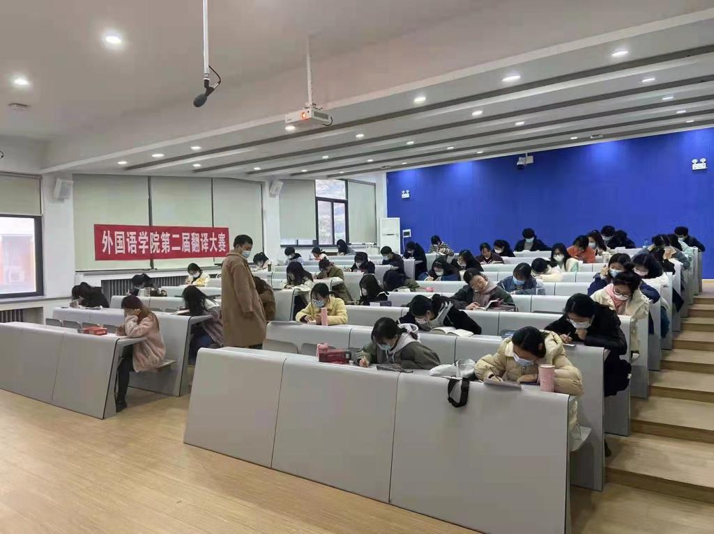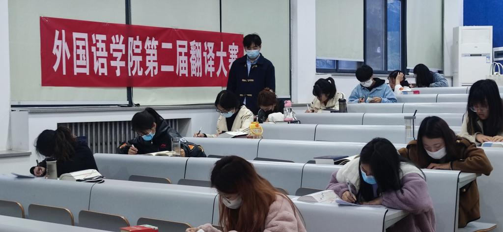 为更好帮助翻译专业学生提高翻译实践能力、掌握CATTI考试的做题技巧与流程,外国语学院翻译教研室于2022年3月23日下午组织了外国语学院第二届翻译大赛,翻译专业近100位学子参与了比赛。响应疫情防控的号召,分别在教1楼109和208布置了赛场,选手保持安全距离,全程佩戴口罩。翻译教研室王明伟老师、王余成老师和张东东老师负责比赛监考。