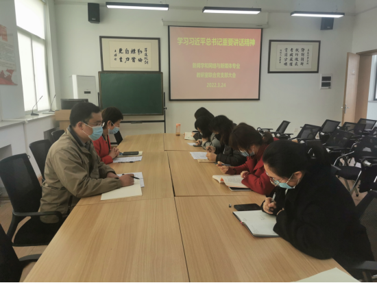 3月23日中午,文法学院新闻学与网络新媒体专业教研室联合党支部在教学一号楼314会议室召开学习习近平总书记重要讲话精神专题会议,支部全体成员参加了会议,会议由支部书记赵静主持。