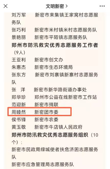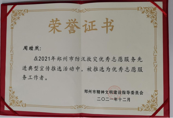 他说“身为共青团员,在家乡遭受灾难时,希望能够尽到自己的绵薄之力,帮助家乡度过难关。虽然很累,但也让我明白了作为青年人应该有的使命和担当”。在2021年郑州市防汛救灾优秀志愿服务先进典型宣传推选活动中,周睦然同学被推选为优秀志愿服务工作者。