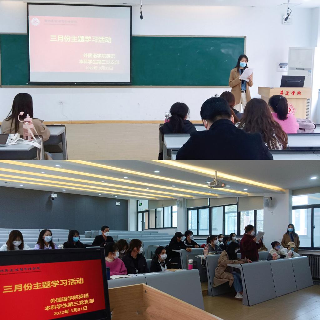 为深入贯彻落实高校思想政治工作会议精神,进一步加强和改进意识形态工作,外国语学院英语本科学生第三党支部,于3月31日15:00在一号楼109开展了专题学习会并安排了学习和实践活动。会议由党支部书记田倩倩同志主持,外国语学院党委书记石皓召同志作为支部普通党员参加了此次学习,辅导员赵志海老师以及英语专业本科学生第三党支部全体党员参加了会议。