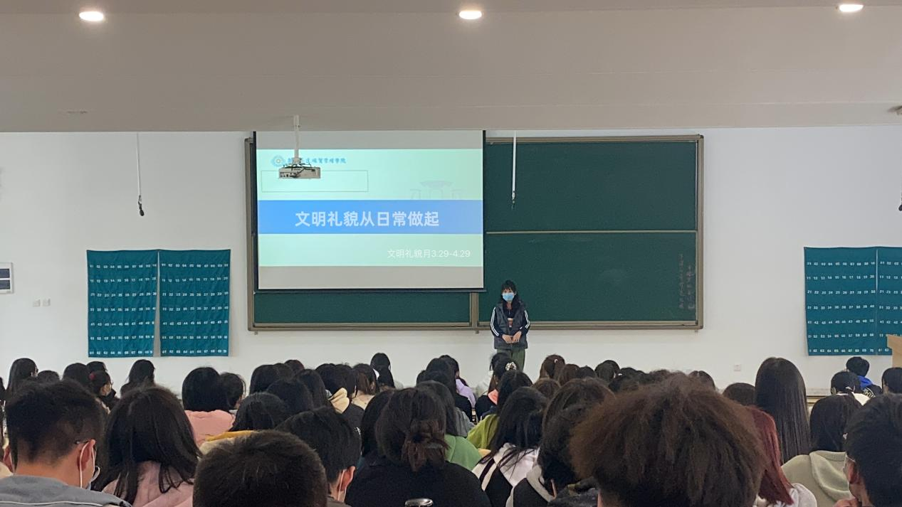 会议伊始,由辅导员刘瑞雯讲述了本次“文明礼貌月”活动的具体内容,包括文明礼仪、文明宿舍、校园禁烟、安全骑行等多个方面。并强调要以“文明礼貌月”活动为契机,以创建文明校园为主线,夯实校园文明根基,打造内容健康、格调高雅、丰富多彩的校园文化生活环境,将文明知识内容内化于心,外化于行,做校园文明健康生活方式的先行者、实践者。