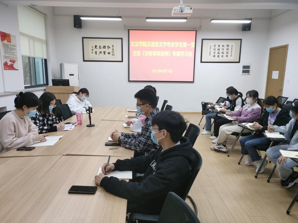 为深入贯彻学习习近平总书记在全国宗教工作会议的重要讲话精神,全面贯彻新时代党的宗教工作方针政策,4月14日,文法学院汉语言文学专业学生第一党支部在1号楼314会议室召开《宗教事务条例》(新修订)专题学习会,支部全体党员通过线上线下方式参会,会议由党支部书记张甜梦主持。