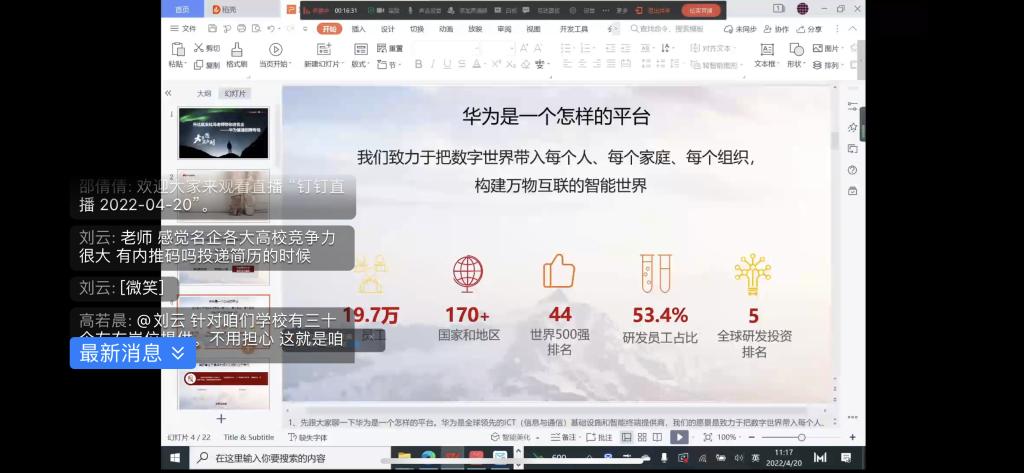 4月20日上午,我校就业处举办了2022届毕业生第五场“就业处冯老师带你进名企-华为慧通专场”直播带岗活动。我校就业处处长冯科老师在钉钉平台上为毕业生求职就业牵线搭桥,特邀请华为慧通河南代表处校招负责人邵经理在线为毕业生直播带岗,我校各专业200余名毕业生参加了直播带岗活动。