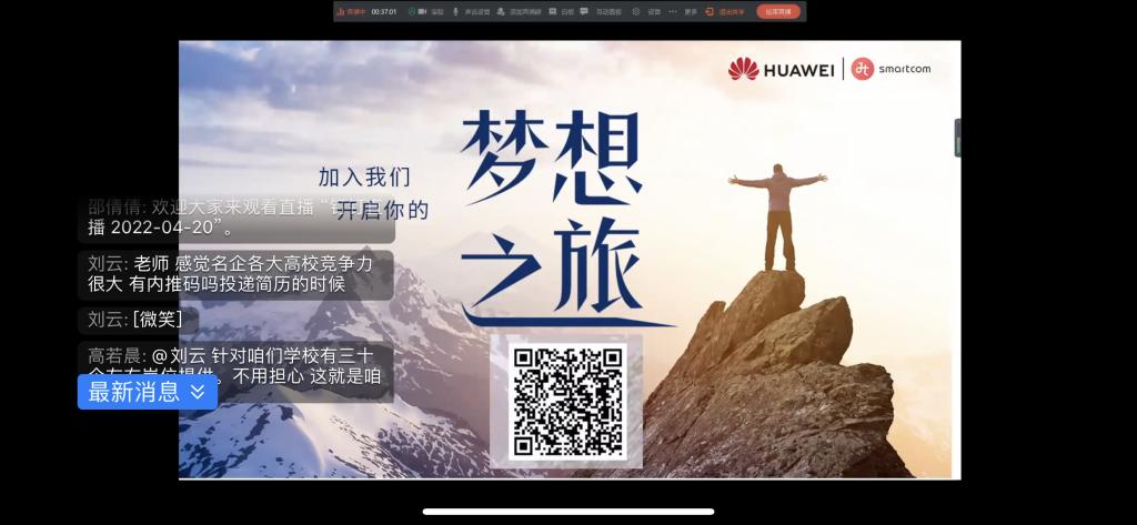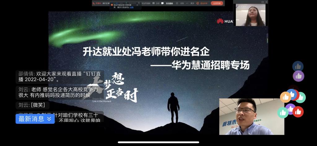 华为慧通河南代表处校招负责人邵经理在直播间以PPT和问答交流方式向我校毕业生介绍了华为平台、消费者业务、智造业务(新能源汽车)、全屋智能、智慧办公、校园招聘等方面,讲述了晋升路径、薪酬回报、工作氛围,提高了同学们对华为集团的认识。通过对招聘岗位、岗位职责、岗位要求以及华为人才管理讲解,激发了同学们的求职热情,增强了同学们到华为慧通公司求职的意愿,同学们纷纷参与互动问答。此外,华为慧通也为入职人员提供华为总部以及海外就业机会,只要工作能力满足,全球业务岗位均可以内推。最后,邵经理对同学们关于简历投递、岗位福利、面试等问题进行了一一解答。