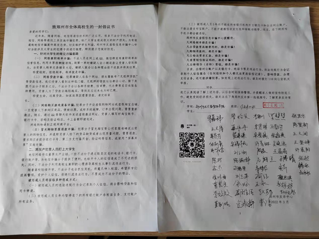 此次防诈骗签名活动的开展旨在切实提高同学们对诈骗犯罪的识别和应对能力,为创建平安和谐的生活环境打下良好基础,在一定程度上遏制电信网络诈骗犯罪的势头,确保学生财产安全。同时,充分激发学生预防网络诈骗相关知识的学习热情,进一步提高了同学们面对典型网络诈骗的防范能力。