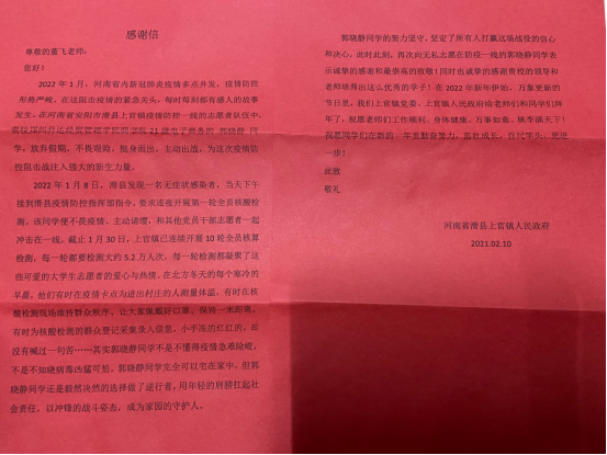信中介绍:“2022年1月8日,滑县发现一名无症状感染者,当天下午接到滑县疫情防控指挥部指令,要求连夜开展第一轮全员核酸检测。郭晓静同学便不畏疫情、主动请缨,积极参加了镇政府组织的大学生志愿者团队冲击在一线。上官镇连续开展的10轮全员核酸检测,每一轮都要检测大约5.2万人次,每一轮检测都凝聚了大学生志愿者的爱心与热情。在工作过程中,她积极乐观,不畏苦累,获得了群众的高度赞誉,赢得了党委政府的高度认可。