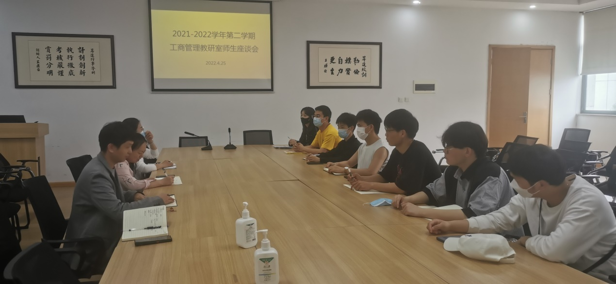 为构建优质高效的课堂教学模式,进一步提升教学质量,及时发现教学中存在的问题,及时了解新形势下学生对教学的新要求,工商管理教研室于4月25日下午在教学2号楼209会议室组织召开了本学期教学质量师生座谈会。工商管理教研室主任董芳芳老师,教研室董飞老师、陈晴晴老师、叶文菲老师,以及工商管理大二、大三各班班长、学习委员参加了本次座谈会。会议由董芳芳老师主持。