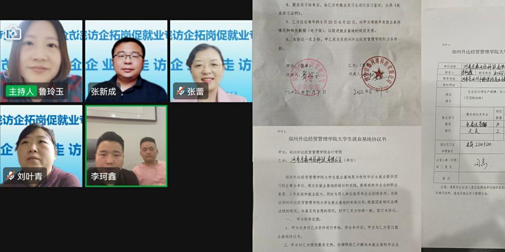 为进一步落实学校“书记校长访企拓岗促就业专项行动”,加强学院校企合作,增进校友感情,促进学生就业,5月7日下午14:30,通过钉钉平台,会计学院院长书记访企拓岗云走访校友企业顺利进行。此次云走访单位是河南启森网络科技有限公司,是由我院18财升本1班毕业生李珂鑫创立的。会计学院党委书记张蕾、副院长张新成、就业专员鲁玲玉、刘叶青与公司总经理李珂鑫共同进行了会谈,并签订了就业实习基地。会计学院就业专员鲁玲玉主持此次活动。