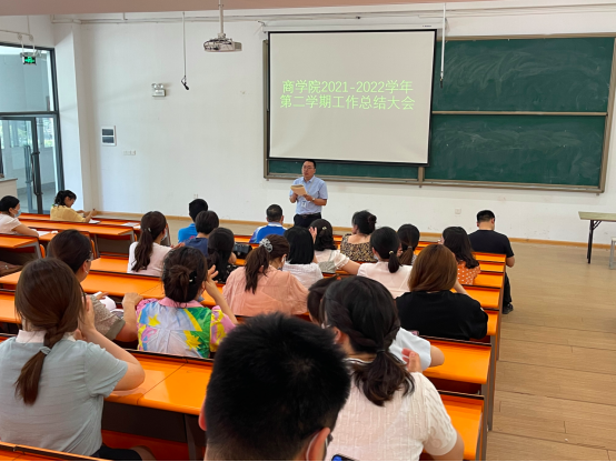 6月17日下午14:00,商学院在教学2号楼116教室召开了“2021-2022学年第二学期”工作总结大会。参加会议有党委书记郭峰、副院长白朋飞、行政秘书郗艳花、教学秘书马巧丽、全体专职教师与辅导员,会议由副院长白朋飞主持。